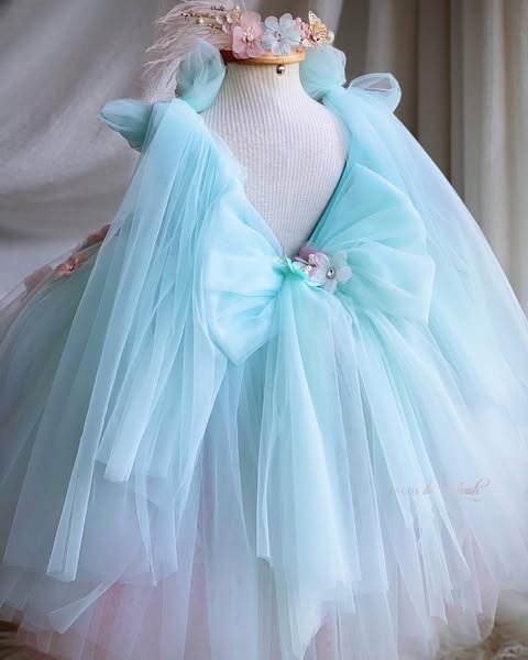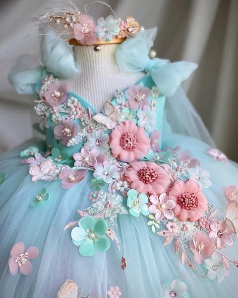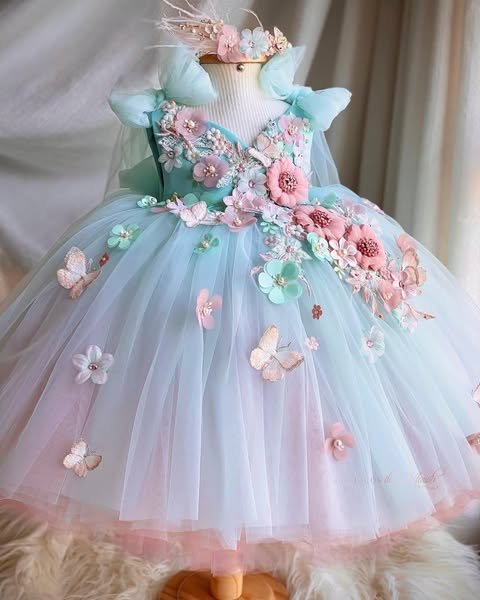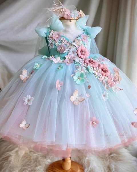 - “Blossom Garden” Collection: Highlighting dresses in soft pink and peach tulle, profusely adorned with a cascade of multi-hued fabric flowers and delicate dragonfly accents, creating a vibrant, playful feel. This also includes the charming aqua blue and pink floral butterfly dress, showcasing a broader pastel palette.