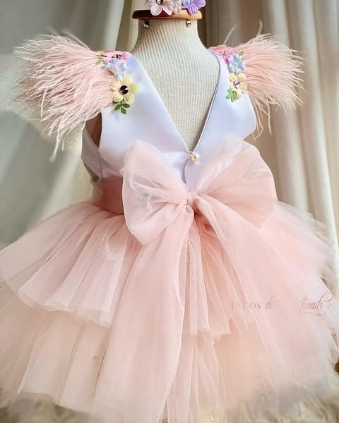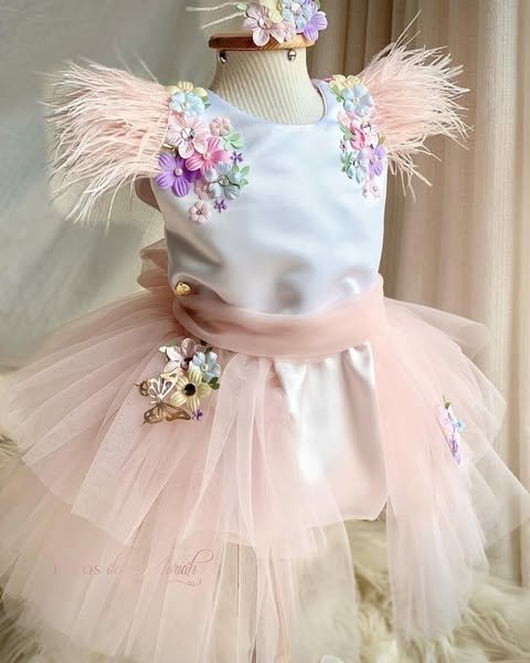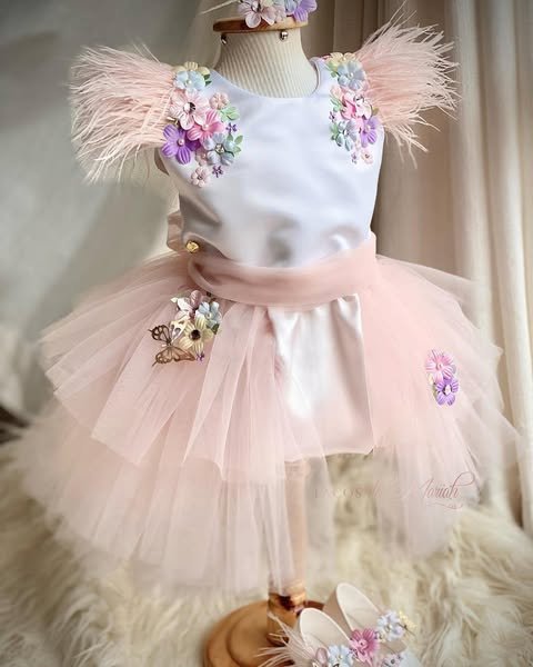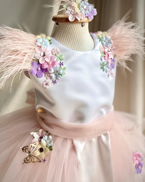 Work- Hand Work. Exquisite hand-applied 3D fabric flowers, meticulously placed pearls, and delicate butterflies create a rich, textured surface. Each embellishment is carefully secured, showcasing intricate artisanal finishing.