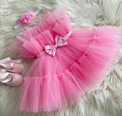 Description: This charming dress features a ruffled bodice, a satin bow, and a voluminous tiered skirt.