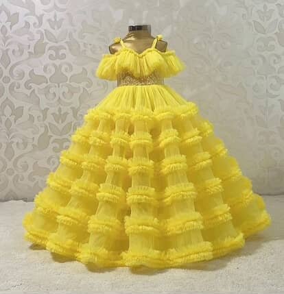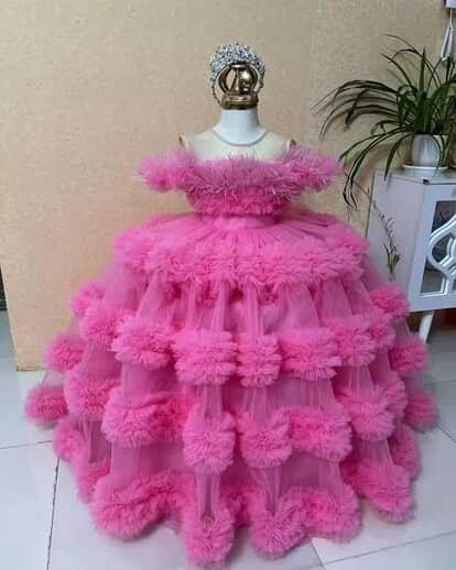 Description: This voluminous gown features cascading layers of ruffles, creating a grand and playful silhouette.
