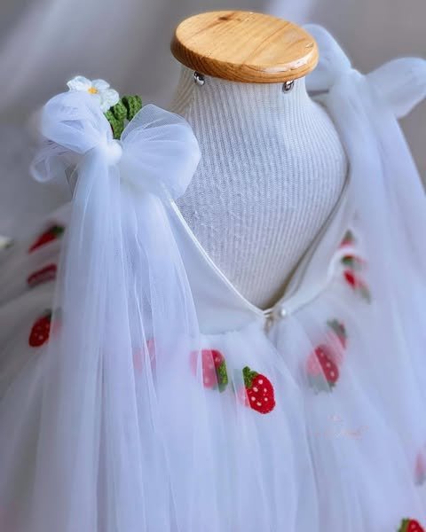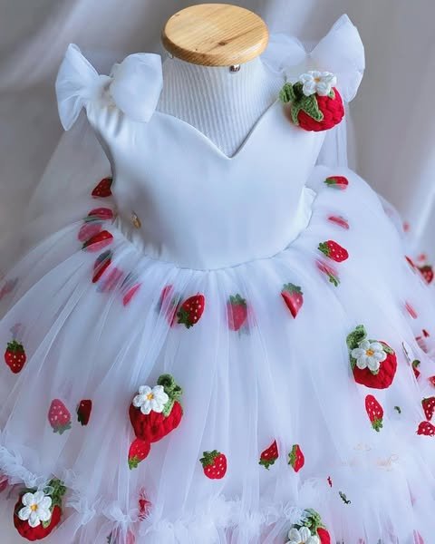 Colour-Crisp white tulle, vibrant red strawberries, green accents.