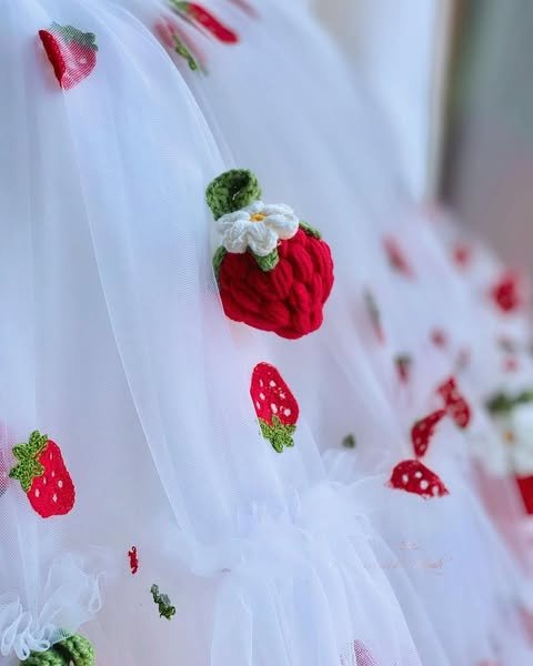 Work-Hand Work (25 words): Features meticulously hand-applied 3D strawberry appliqués in varying sizes, along with smaller embroidered details, creating a charming, textured, and delightful visual effect.